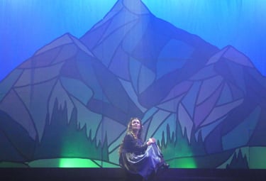 "Through the clever artistry and handiwork of the set designer, the large, but plain, performance hall captured vestiges of a place of worship: Natalie crafted six mock ‘stained glass’ windows to hang high on the hall’s side walls. Each colourfully depicted a different scene from the show."